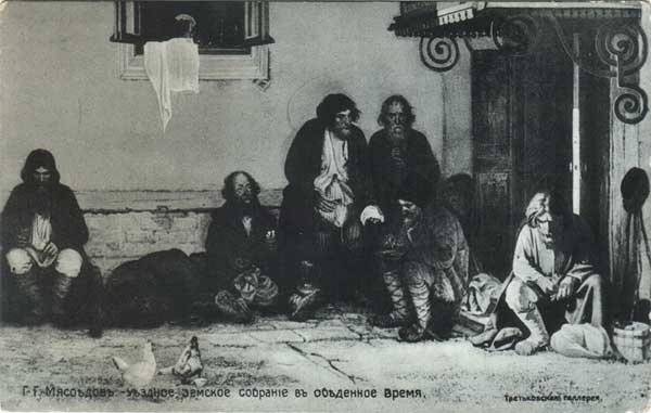 В обеденный перерыв крестьяне, сидя на земле у крыльца земской управы, утоляют голод хлебом и луком.