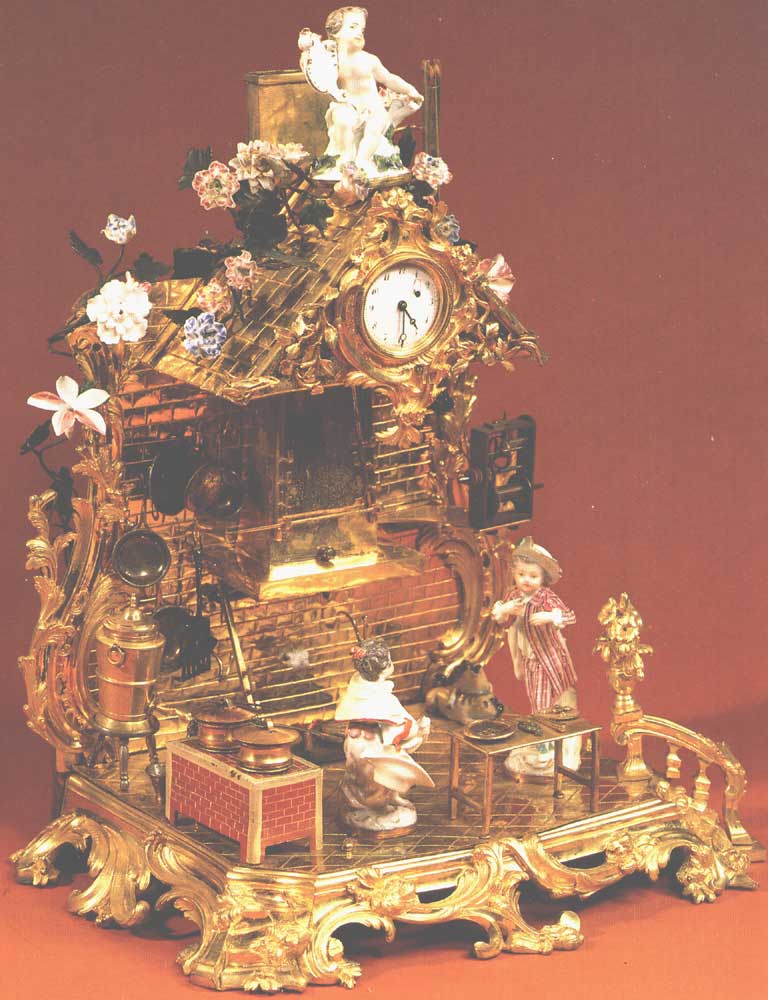 - This clock is fashioned as a miniature kitchen interior, with a fireplace, a stove and various utensils